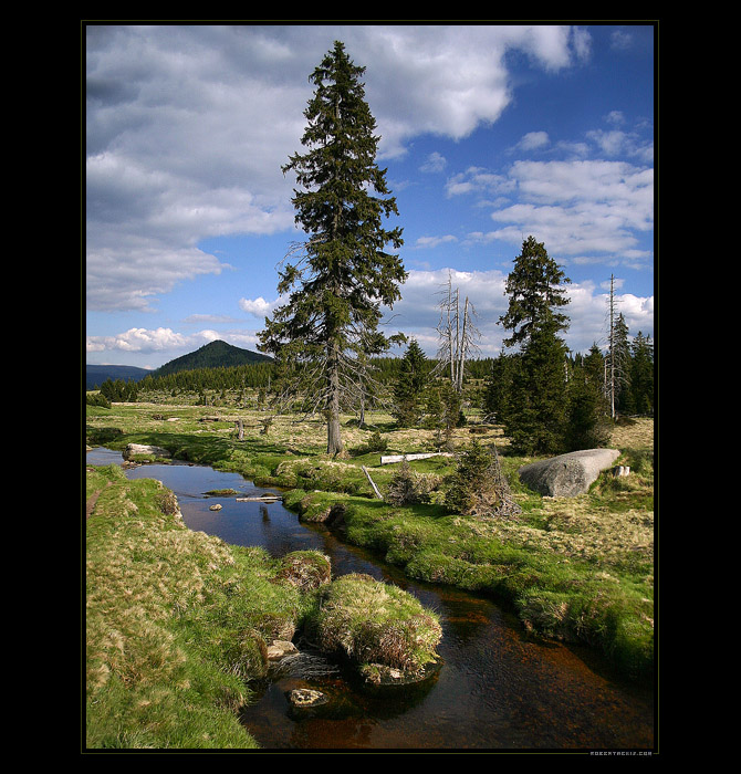 Nafotil jsem zde několik variant, pokoušel jsem se i o třetinovou kompozici. Ať 1/3 či 2/3 pro zemi, ale vždy díky stromu a potoku vyšel optimálně horizont na střed. Zlatý řez není dogma a tady je k ničemu.