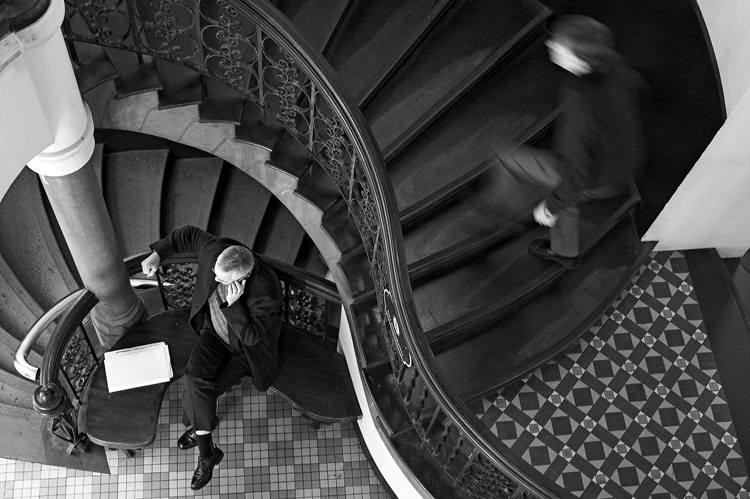 dobrá to momentka pěkně zachycující dnešní dobu ve staré budově, být to momentka z původní doby, tak tam v poklidu půjdou dvě spolu komunikující osoby