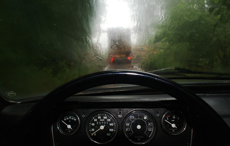 ...ráno jsem byl fotit v lese. Byla mlha a pak začalo pršet. Lesní cestu mi zatarasilo auto, co nakládalo vytěžené dříví. No, a já ve staré zamlžené škodovce takhle strávil půl hodiny. Proč někam spěchat?