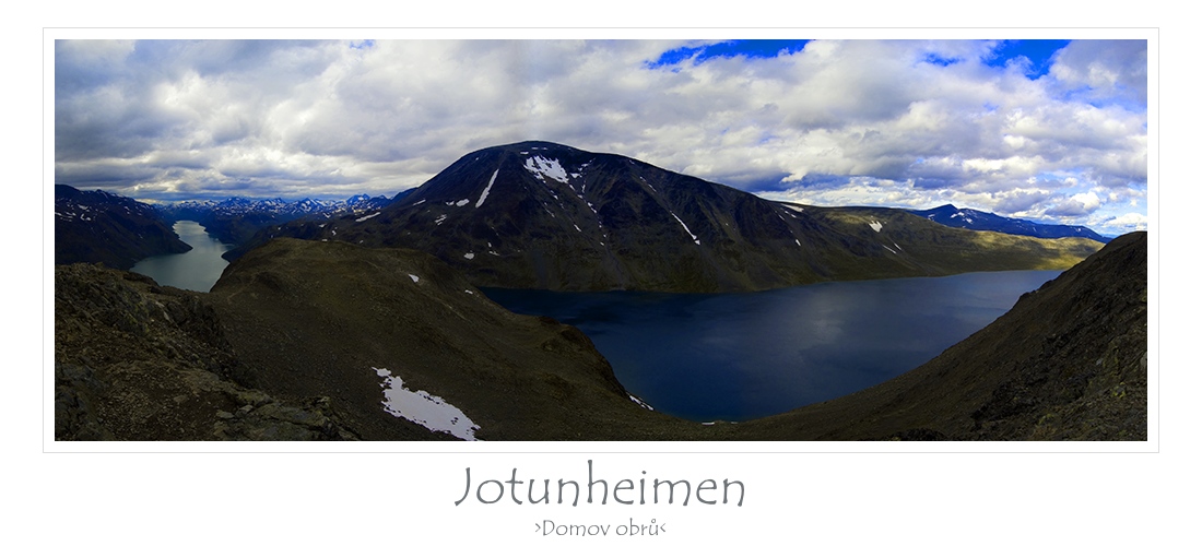 Přesný překlad jména pohoří Jotunheimen zní "domov obrů". Vlevo jezero Gjende, Uprostřed hora Bessho (2258), jezero v popředí se jmenuje Bessvatnet.
