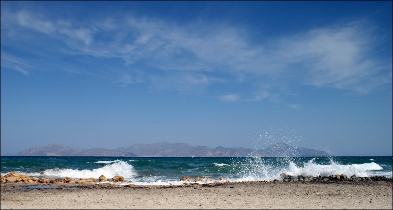 foceno z ostrova KOS v pozadí ostrov Kolymno, využítí jen trošku mlhy na obloze , bylo pořád modro