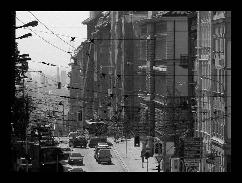 Ivane, je to tak příšerně šedivé a nekontratní z toho důvodu, že kdybych přidal kontras či přitlačil jen na černé, ztratí se troleje na pozadí domů...