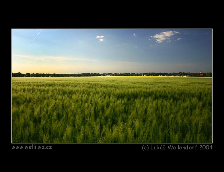 tráva v popředí je pěkná, nebe se mi už tolik nelíbí... s tim písmem v rámečku opatrně. Myslím, že drobné písmo na hranici viditelnosti je nejvhodnější... ;)