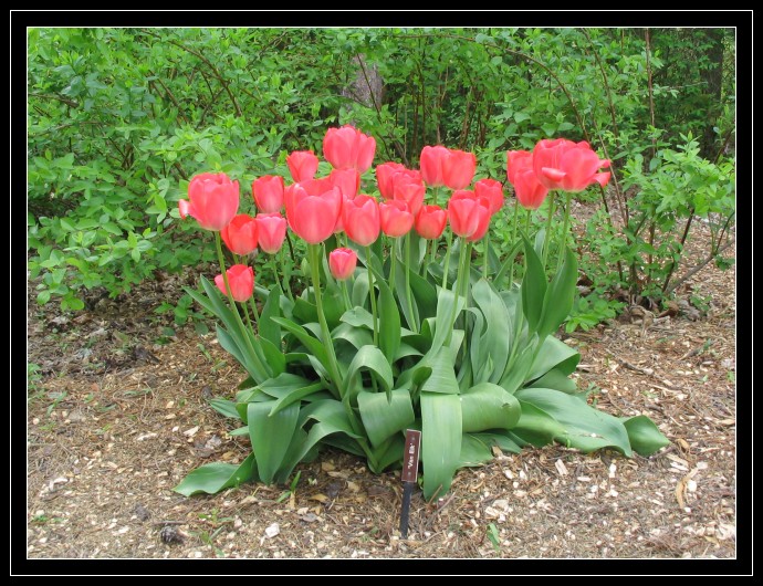 co se nepovedlo: Středová kompozice, cedulka před tulipány, květy jsou neostré a splývají, rámeček je pohřební.