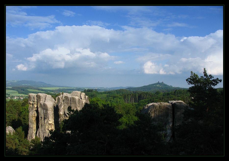Foceno z jedné vyhlídky nad Sedmihorkami směrem k zámku Hrubá skála
