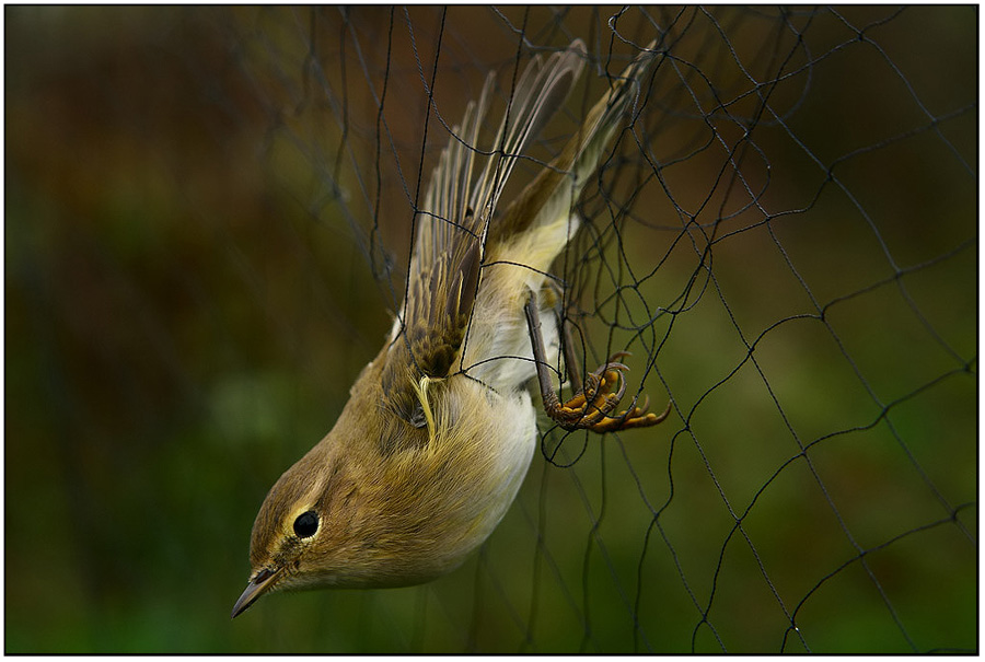 Kolibkárik čipčavý (Phylloscopus collybita). Takto sa chytali vtáky do ornitologických sieti na jeseň tohto roku na stacionári v Drienovci.Siete sa kontrolovali každú hodinu, vtáčiky sa ľahko vyberali a následne krúžkovali a púšťali do voľnej prírody. Bezpečná metóda a pre ornitológov veľmi dôležitá kvôli dokumentácii migrácie a veku vtáčích druhov. Príjemný večer.
