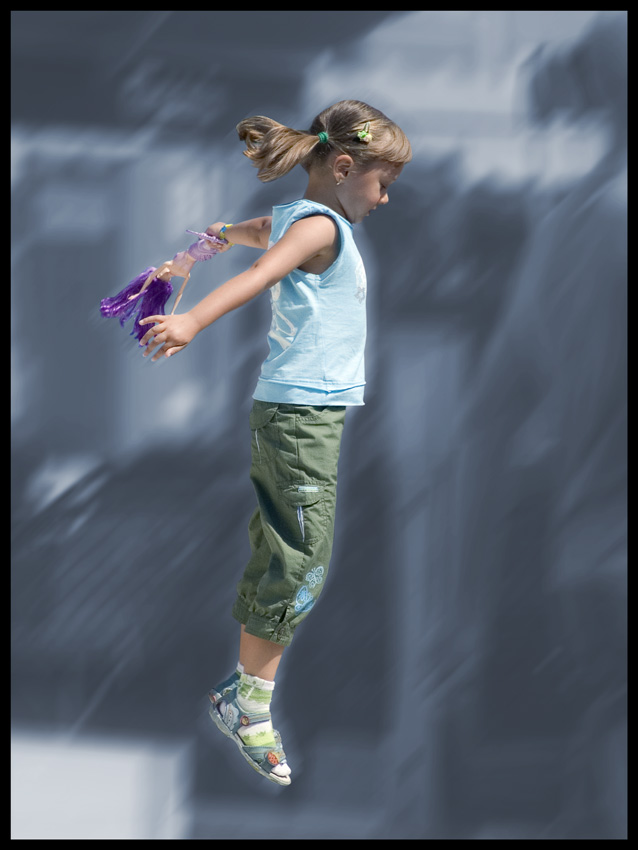 Dochtore, hele, předpokládám, že slečna po seskoku letěla z leva z hora doprava dolů. Kdybys ji sledoval foťákem, musely by být rozmazané pruhy ve stejném směru. Nebo ne? Takhle to vypadá, že skákala pozpátku. Nechci být za šťouru, ale něco mi tu nehraje. :o) Heh, skákala, jak jsem řekl, BO jí copky míří doleva. Ale i přesto to na první pohled vypadá sympaticky. Taffey.