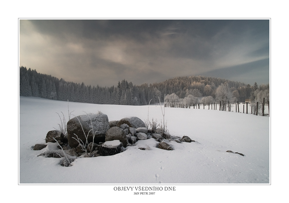 A ještě k fotografii - místo mě zaujalo neuvěřitelným klidem, zajímavou atmosférou krajiny na hranici inverzní pokličky a skupina kamenů v popředí vytvořila krásný, kompozičně velmi dobře využitelný oblouk. Malý problém byl jen s jemným sněhem, který nepřetržitě poletoval vzduchem.