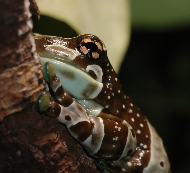 Na té fotce to není moc vidět, ale jak byla v teráriu nasvícená shora halogenem, prosvítaly jí neonově zelenou barvou přísavné polštářky na koncích prstů. Mrzí mě že jsem to nezkusil bez blesku, stativ jsem tenkrát ještě ani neměl. Sigma připláclá sluneční clonou na upatlané sklo, blesk na kabelu kousek stranou. V brněnské ZOO..