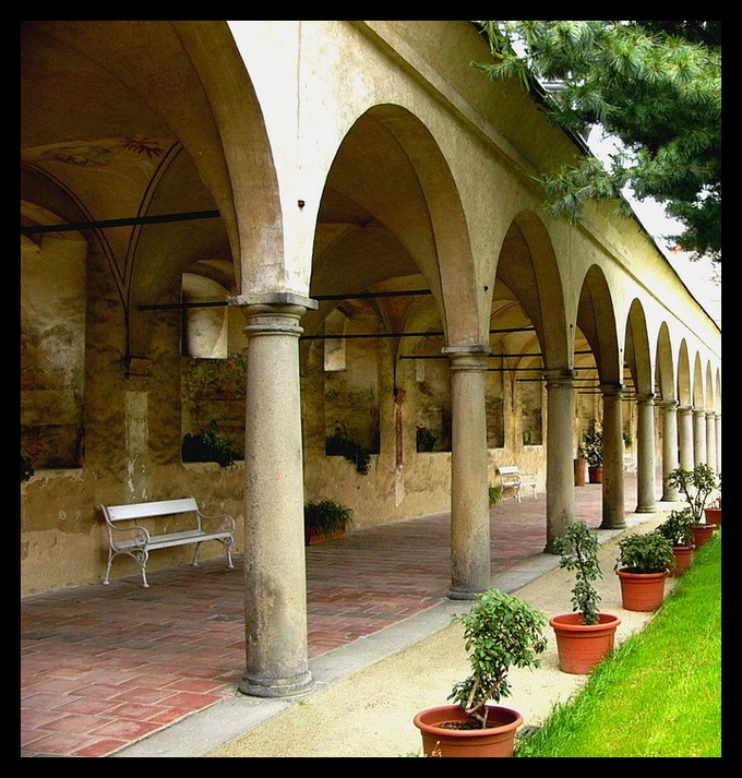 mám ráda sloupy a tu barvu zdí...jen pozor na přepaly(zeď,obloha...:)a zkus jen ty zdi a sloupy bez květináčů s kytkama,nebude to působit tak lázeňsky,ale víc historicky:)můj názor:)