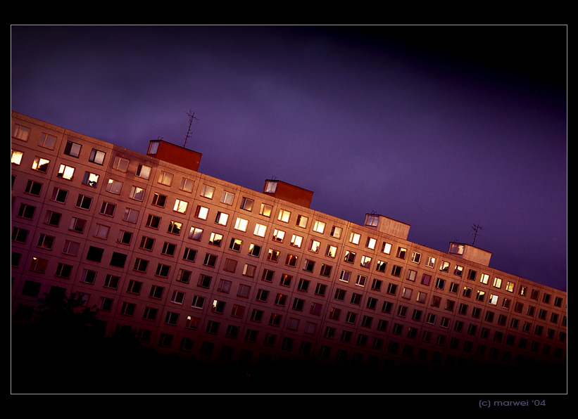 Na jedne strane se schylovalo k bouri, na druhe zapadalo slunce, vlastne v hornich patrech se stale jeste sviti...
