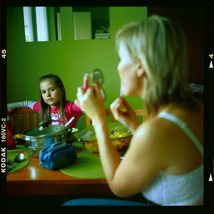 Tétéčko ... vždy obdivuji, že třeba jako PP dá odkaz na origi, (já si pokáždé, přiznávám, ať pinholově, kvůli upevňovacímu rámečku v piksle, či flexaretkově i zenitově při_říznu), tak i zde je vidět plnost pole. Můžu napsat, že jsi moh´ ne_uříznout ruku dcerky, kdy poté by bylo vidět i zrcátko ukazujíc, že mamka má "klaunovské" namalováné rty (pery)... Líbí se mi dofovost, barevnost (ta zelená je úžasná), líbí se mi moment erotického podprsenkového podávání zapečeného obědu, mohu namítat cokoliv proti poškrábaní filmu....? Líbí se mi zrcadlení. Fotografie se mi líbí. Pěkná pětka.