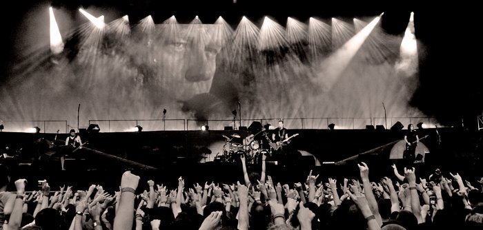 fotka ma imho zajimavou kompozici, pohled z lidi na cele podium s hudebniky i tvari na projekci je dobrou soucasti vice-fotkoveho-reportu ... nechapu ale tu barevnou upravu