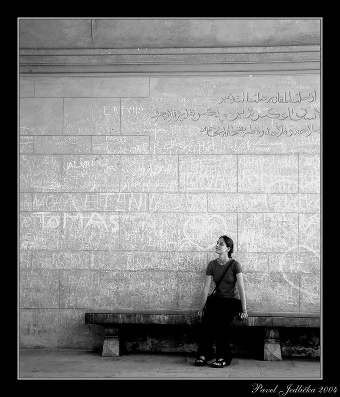 Dívenka se usmívá tak jak chtěla, není to umělý úsměv kvůli focení. Usmívá se nad nápisy, které si čte na protější stěně.