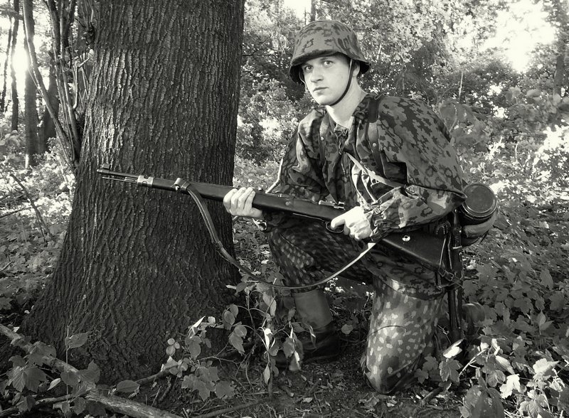 Fotka nepředstavuje žádnou akci a její smysl byl pouze v tom, aby se dotyčný mladík viděl, jak mu to sekne. Foceno v listnatém remízku s protisvětlem, převedeno do BW + 5% žluté, ořez nepatrný.