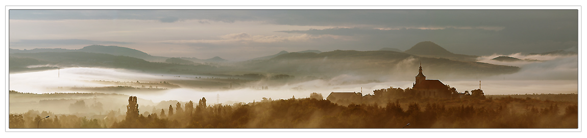 Kdesi v mlze za kostelem se schovává obec Vtelno.
