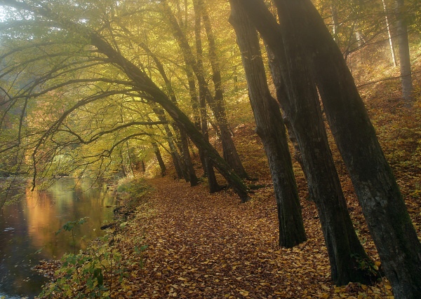 Na fotce je použit tzv.mlžný filtr COKIN a to záměrně, mám ji samozřejmě i bez filtru, ale takto mi připadá zajímavější. Jinak ty stromy na prudkém svahu jsou skutečně nakloněné - možno porovnat s hladinou řeky vlevo.Na to si již dávám pozor a navíc to kontroluji již při focení pomocí vodováhy na stativu.