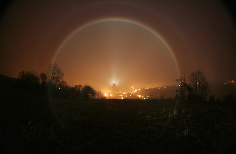 z inverze vypadavaly drobné kapky, které svou velikosti již stačily vytvořit obyčejné barevné duhy.bonusem pak byl podružný duhový oblouk jenž vzniká interakcí již odraženého světla od dalších kapek.na snímku jako bila čarka pod hlavní duhou.