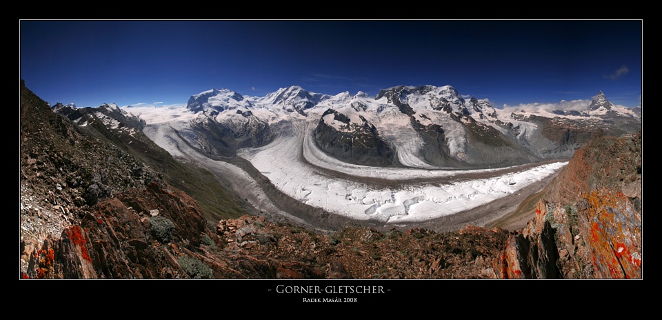 Zleva: na konci ledovce vpravo Monte Rosa (Dufourspitze) 4634m.n.m., dále pak Liskamm 4527m.n.m., Castor 4228m.n.m, Pollux 4092m.n.m., zaoblený vrcholek je Breithorn 4164m.n.m. a pod ním vpravo Matterhorn glacier paradise 3883m.n.m. a nakonec samotný Matterhorn 4478m.n.m..