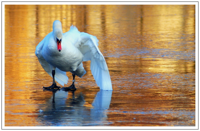 Podle mě to fotomontáž není. Prostě stojí na ledě. Ta barva ledu se mi líbí to modré peří nee..