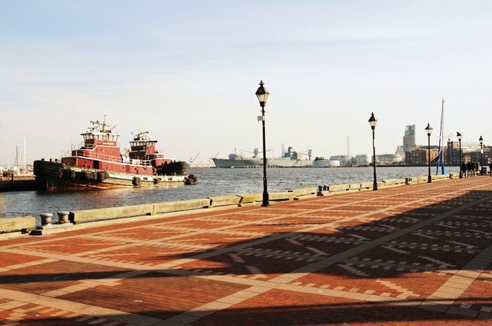 USA,Baltimore,pristav, lode cekaji na praci,pristav zeje prazdnotou..