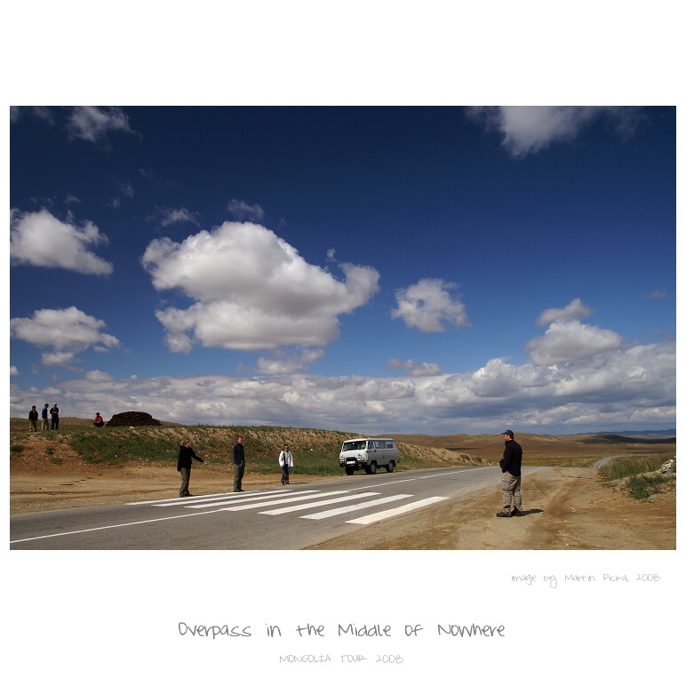 Je to jedna z mala asfaltek v Mongolsku a predstavte si, ze jsme na ni narazili na prechod pro chodce. Upozornuju, ze siroko daleko bylo maximalne 5 jurt a hustota provozu odpovidala teto aglomeraci. Za pul hodiny projela dve auta...