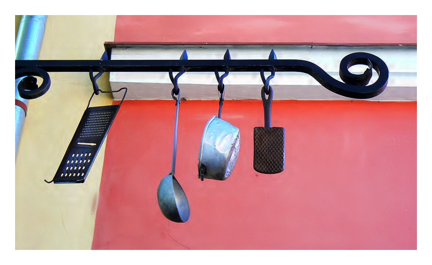 Okap neruší, ladí s cedníkem a šufánkem a na bílej pruih byhc se snažila nacpat i špicu a hák od struhadla. Ergo, fotit maličko víc zleva.