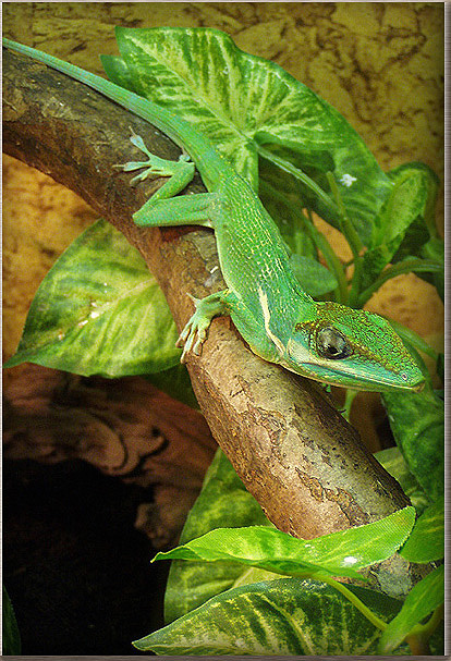 Možná jsem moc hrdej, ale mě se líbí víc můj chameleonek:-) Taky mám raději u zvířat malou clonu a ostření na očičko. Ten ocásek by hezky splýval s listím v pozadí. A v popředí by zanikl ten umělý list. Jinak se mo to kompozičně líbí. Jen tak dál!