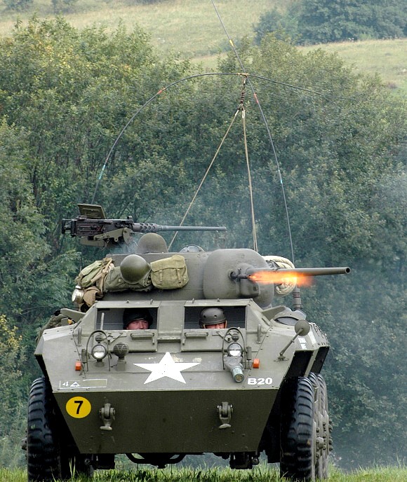 Je to M8 "Greyhound" Střelbyschopnou třicítku v tom rozhodně nemají, ale správně by tam měla být. US ráže 30. odpovídá naší 7,62 mm.