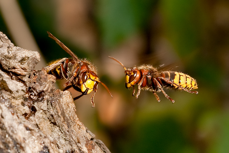 Jednou jsem tuto akci již fotil, ale ten obrázek co vznikl byl ze značné části dílem náhody. Tentokrát jsem se hodně soustředil, abych přines co nejlepší výsledek. Ty sršně se chovají dost vypočítatelným způsobem. Když jedna obsadí místo výronu mízy tak nejdříve ostatním hmyzákům ukáže kdo je tady pánem. Mravenci, kteří jsou běžnými návštěvníky přírodního hostince tuto okupaci často zaplatí životem. Sršní kusadla jsou mocnou zbraní. Při příletu jiného sršně se první vztyčí do výhružného postoje s předními nožkami ve vzduch (fotka přidám někdy časem). Nový příchozí reaguje dvojím způsobem. Buď odletí hledat jiný zdroj zákvasu nebo se ve stylu kamikadze bezhlavě vrhne do boje. Doslova jako beran hlavou narazí do hlavičky nepřítele. Je to taková šupka, že to připomíná cvaknutí závěrky. (To co vidíte na fotce je pikovteřina před nárazem - ten úder mám taky, ale je to mázlé. Přeci jen se to odehrává rychleji než je moje schopnost přeostřit.) Tento úder má za následek to, že se oba protagoni