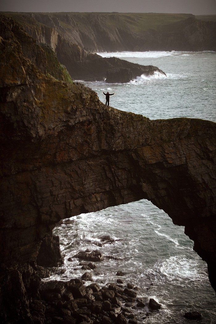 ... presne tak prazyvaju tuto skalu. Neskusam hadat kolko rokov takato prirodna krasa vznika... ale musi to byt velmi dlho. Nachadza sa na juznom pobrezi Walesu. Tak krasne clenite pobrezie som este nevidel. Tam, kde momentalne stojim... to je asi 1 meter siroke... po tom moste sa da prejst az uplne na koniec... ale odvahu som v tom silnom vetre nenasiel... mozno nabuduce za lepsieho pocasia :). Moja vyska je 190cm... tak vysku tej skaly si vyratajte sami :)