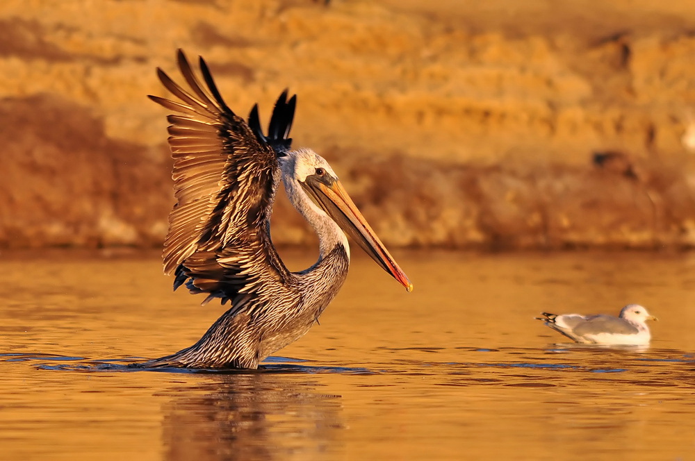 Hnedý Pelikán si užíva posledné lúče slnka pred západom v Santa Cruz, pobrežie pacifiku.