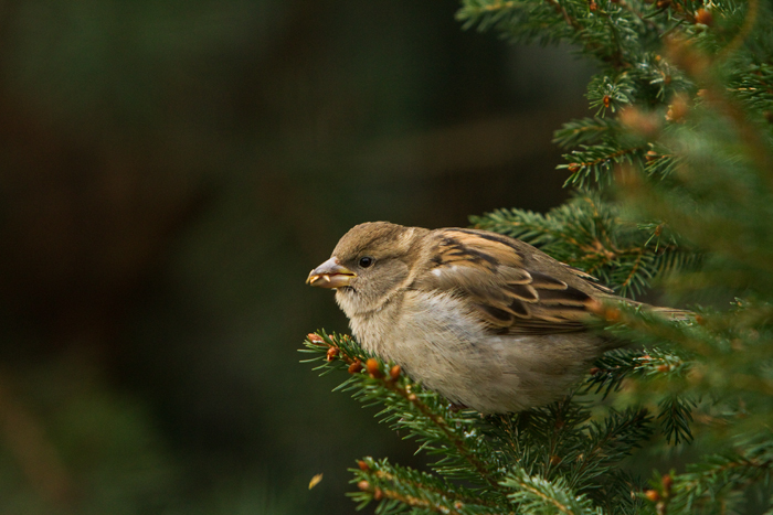 Vrabec domácí (Passer domesticus), Autor: Martin Chrt, Model: Canon EOS 7D, Objektiv: Canon EF 70-200mm f/2.8 L IS USM, Clona: 5, Doba expozice: 1/400 s, ISO: 1600, Kompenzace expozice: -1, Blesk: Ne, Vytvořeno: 27. prosince 2009 13:22:10, Hluboká nad Vltavou (Česko)