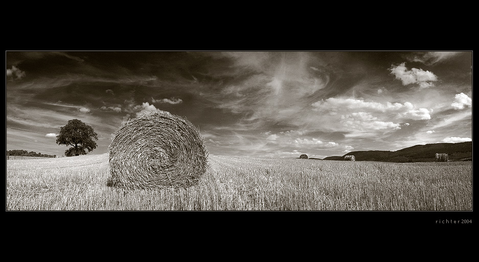 Bez vztahu k hodnocení - vypadá to, jako když je za tím balíkem nějaké zakřivení prostoru - jak strniště, tak trochu mraky jsou tam "nasávány".
