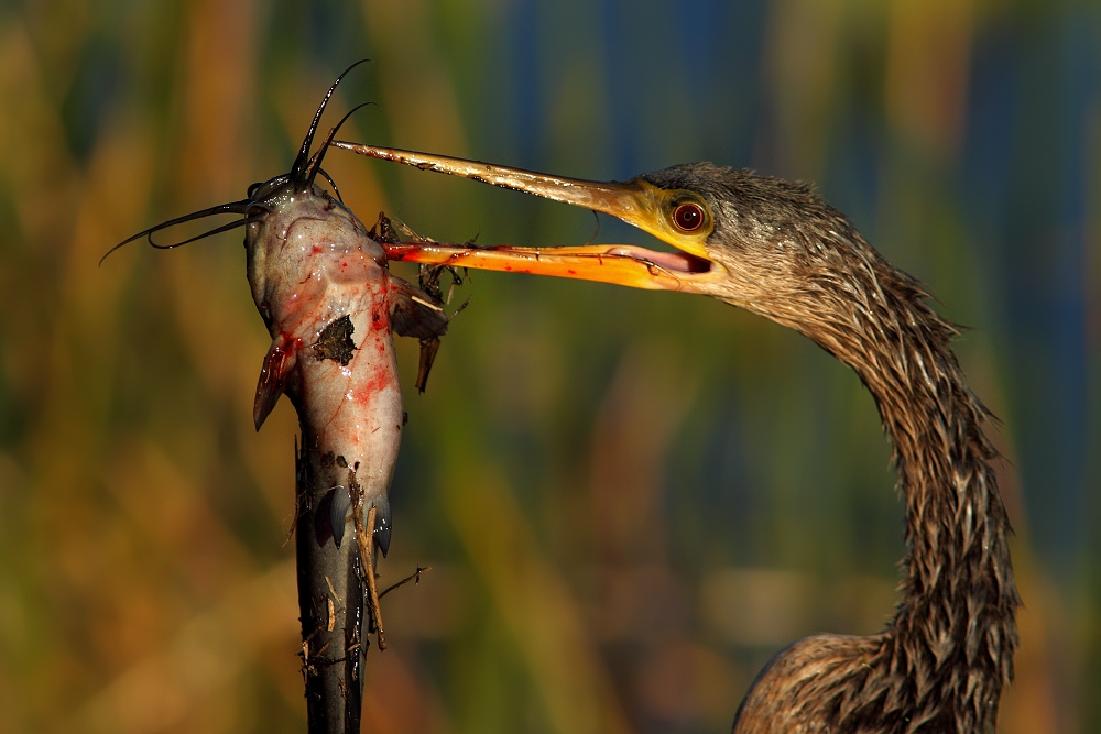 Krásné večerní světlo, příjemná procházka v národním parku Everglades a v tom na mě kamarád křikne, koukej, co ta anhinga ulovila. Dlouhou dobu se s tak velkým úlovkem nedokázala popasovat, nakonec ale celý sumeček skončil, tam kde měl.