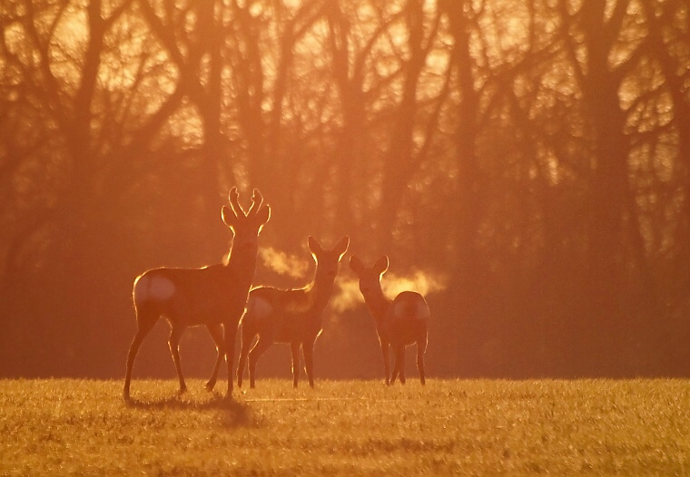 Dnes rano som s bratom sedel asi hodinu, ale nic neprislo. Tak sme sa isli pozriet na pole za nami. Zbadali sme srnu, avsak v protisvetle. Ako sme sa k nej priblizovali, z lesa pri nej zacali postupne vybiehat dalsie kusy. Bolo dost zima, tak sa im parilo z ust :), ale boli dost daleko :( . Technicka kvalita utrpela...