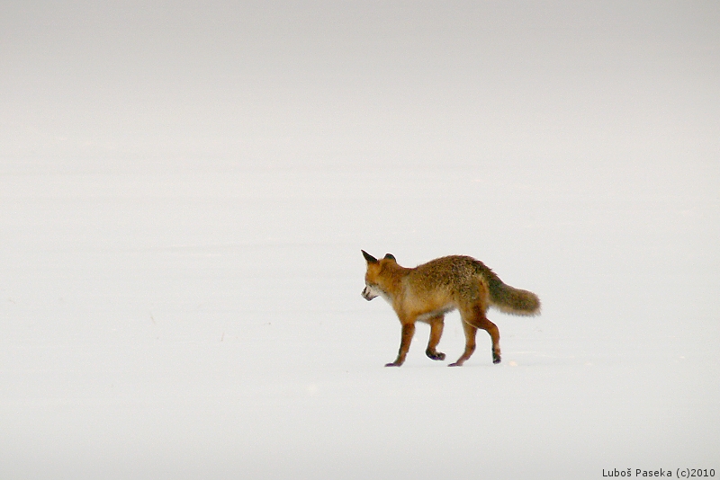 Šel jsem ještě ráno za tmy, sněhová pokrývka dosti křupala a bořil jsem se tak 20 cm, na šoulačku dost nepříznivé podmínky, ale nevzdal jsem to. Přišel jsem na oblíbené místo a liška nikde, no asi mě slyšela říkal jsem si. Vyšel jsem na nejvyšší kopec, kde se nachází betonová skruž s bodem triangulační sítě a usadil se. Čekal jsem na východ slunce, za nedlouho skvělá atmosféra, slunce se dralo na oblohu a nad hlavou mi prolétl krkavec. Po chvilce jsem se zvedl a chtěl odejít a všiml si dole na louce lišky. Přiblížil jsem se ke smrkovému porostu a liška měla tendenci jít směrem na mě. Připlazil jsem se za foliový balík kolem kterého byl vyfoukaný sníh, zalehl jsem, vyndal z kapsy myškovačku a spustil koncert. Liška zareagovala a mírným obloukem se přibližovala. Byla ode mě blíž než 50 metrů a pak se jí něco nezdálo a znejistila, mačkal jsem spoušť fotoaparátu a uklidňoval své tělo, které se celé chvělo, neskutečný zážitek. Liška si to ovšem rozmyslela a vrátila se na původní směr a pokr
