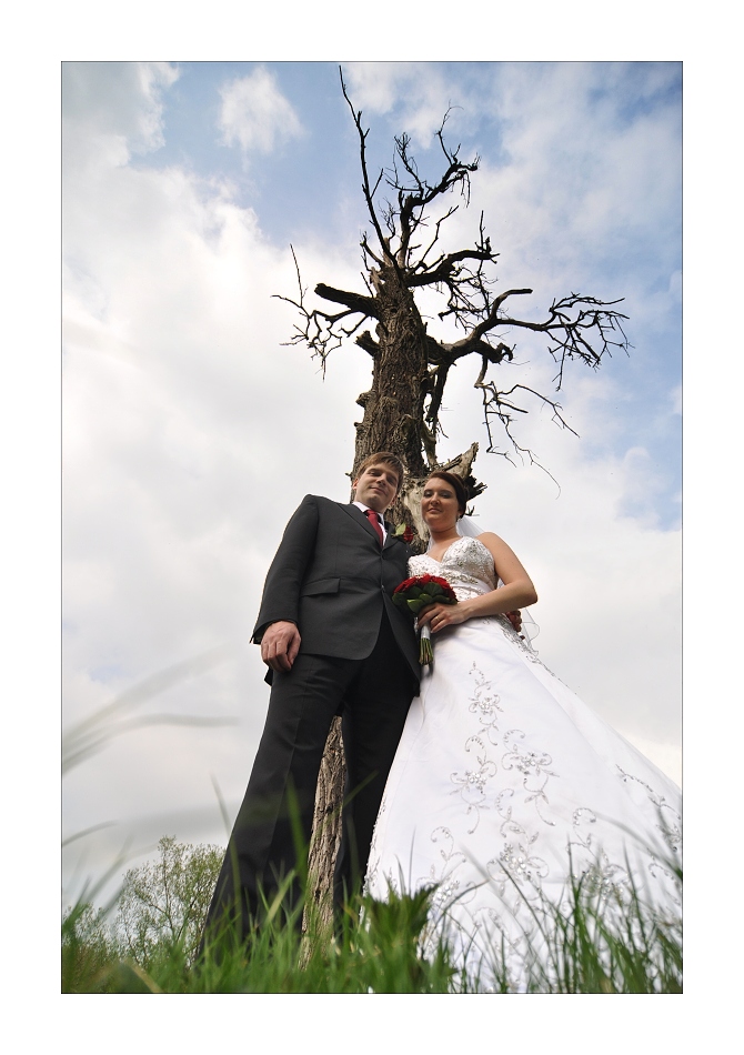 nelíbí se mi tohle provedení - strom roste ženichovi z hlavy a kmen mu vyplňuje prostor mezi nohavicemi, nevěsta má větev zabodnutou do drdolu ... Nápad asi dobrý, ale při zachování tohoto podhledu ( ta tráva je fajn ) bych tu dvojici stavěl prostě jinak ...
