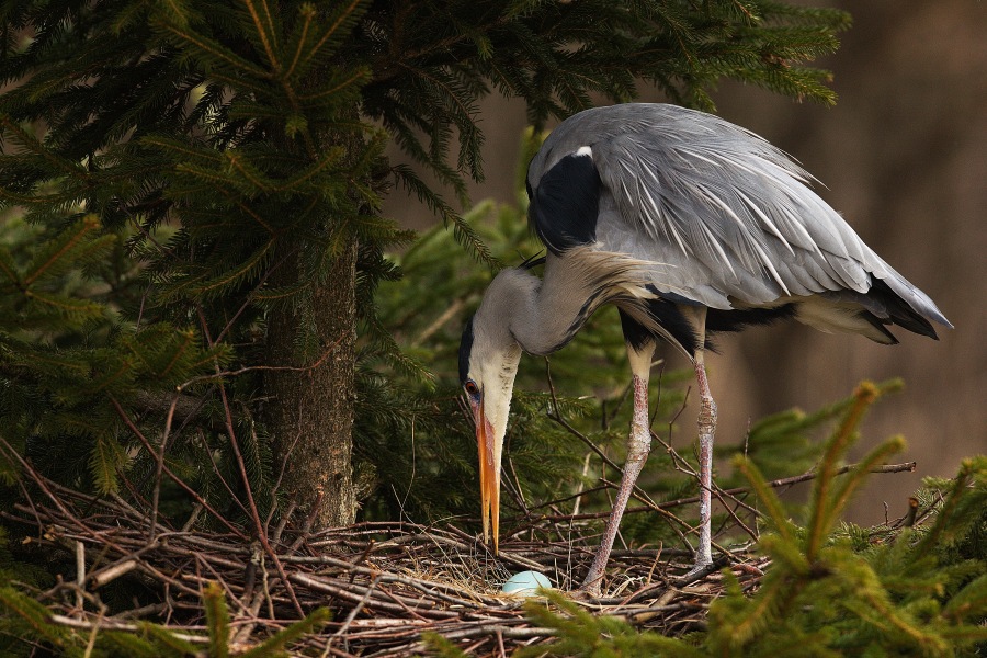 volavka hnízdící na jehličnanu, netradiční, hezký záběr