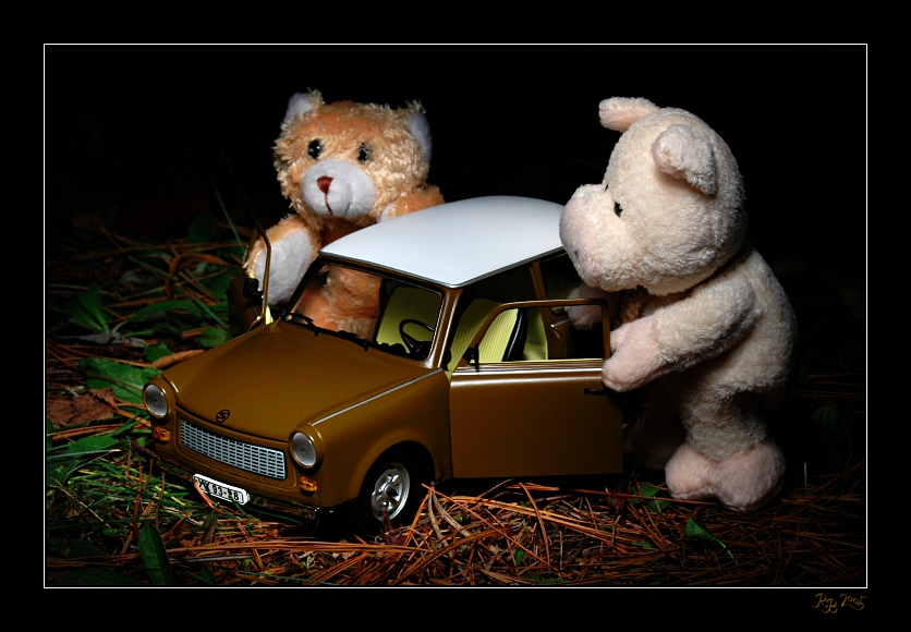 5+, fajn nápad...dobře vyfoceno...akorát se mi víc líbí model auta než plyšáci
