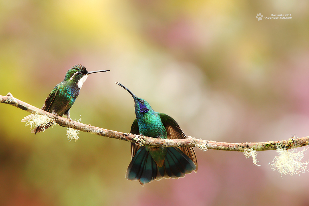 Například tento (Green Violet-ear, Colibri thalassinus) nastraží (roztáhne) doširoka fialová ušiska, roztáhne ocasní ploutev a pomaličku se posouva po větvičce a otevírá zobáček... než to druhý psychicky neunese a veme do zaječích :-D