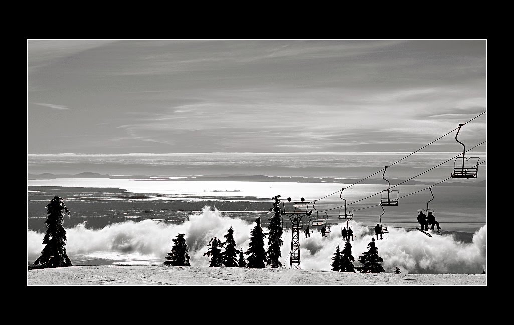 Foceno z nejvyssiho bodu Cypress mountain - strediska leziciho nedaleko od Vancouveru. Cast meste je videt v pozadi.