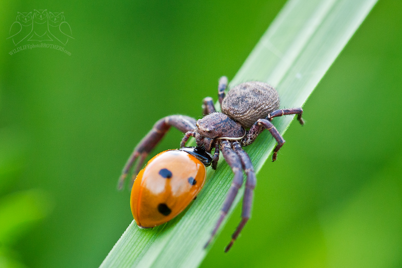 Svetelné a veterné podmienky boli na fotenie dosť zlé. Preto som dal nižšie clonové číslo a vysoké iso. Aj keď by sa žiadala vyššia hĺbka ostrosti, čas bol aj tak pomerne dlhý. No napriek nižšej TK sa mi páčil ten kontrast medzi lienkou a pavúkom.