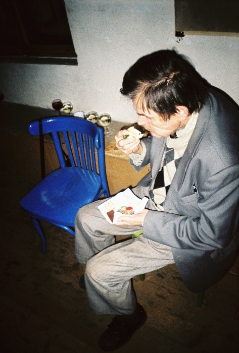 Na vernisážach sa bežne je. Aj takto, ako je kto zvyknutý. Pravdepodobne kolega od modrej stoličky práve fotí, sám nie je ani neje.