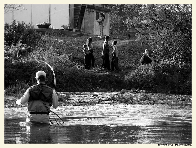Mistrovství Evropy v muškaření v Tatrách. Fotograf fotí muškaře z romské osady. Jen co se usadil, kolem něj se srotilo spoustu malých děcek a z té maringotky za ním vycházeli stále nový a nový až jsem koukala kolik se jich tam vejde:-))