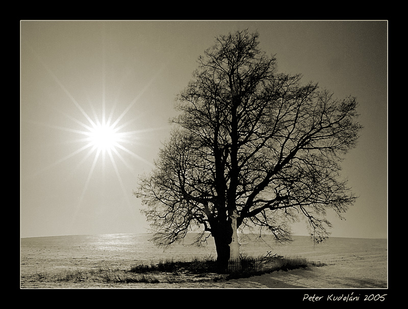 Celkově pěkné. Myslím si však, že boží muka jsou nadbytečná (chápu, že se nedaly odstranit), díky vzrůstu stromu by se mi více líbilo, kdyby byl strom vlevo a slunce vpravo - strom by se kmenem dostal více ze středu snímku a jeho pravá silná větev by opticky "přitahovala" sluníčko.