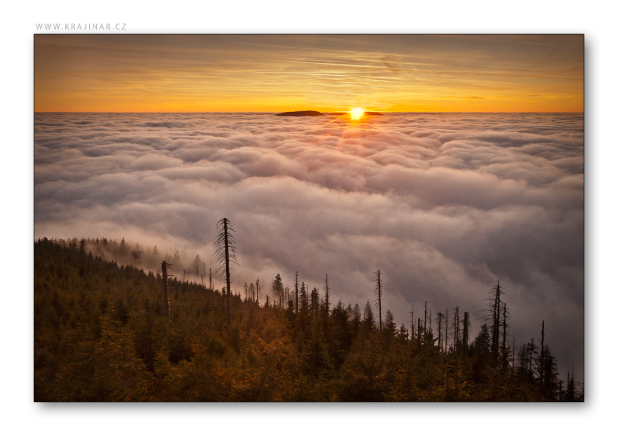 Atmosféra onoho podvečera byla zcela unikátní. Podzimní inverze a žádný sníh. Pozorovatel si mnohdy řekne, že příroda je nejlepší malíř a jen s pokorou kouká na ty nádherné barvy, strukturu mraků a nádherné zapadající slunce.