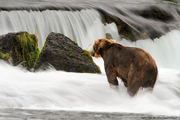 Každý medvěd má jinou techniku lovu lososů - tento stál pod vodopádem a neustále otáčel hlavou, zde neuvidí skákat lososa. Při fotografování byla digitální tma, tak jsme zkoušeli delší časy. Toto je výsledek.