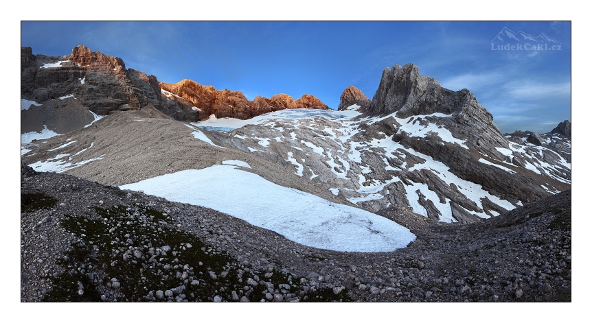 Dachstein je ten kopeček přesně uprostřed, pod ním je vidět zbytek ledovce Gosau..