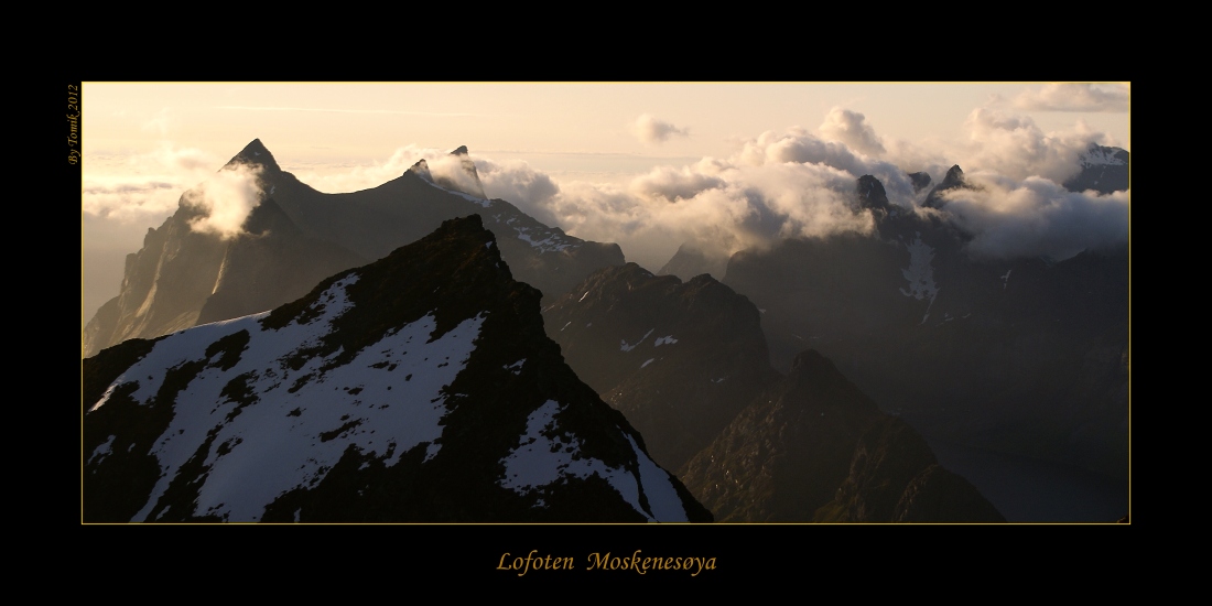 Z leva vrchol Stamprevtindenu, předním 500m vysoká stěna Helvetestindenu nad pláží Buneset...